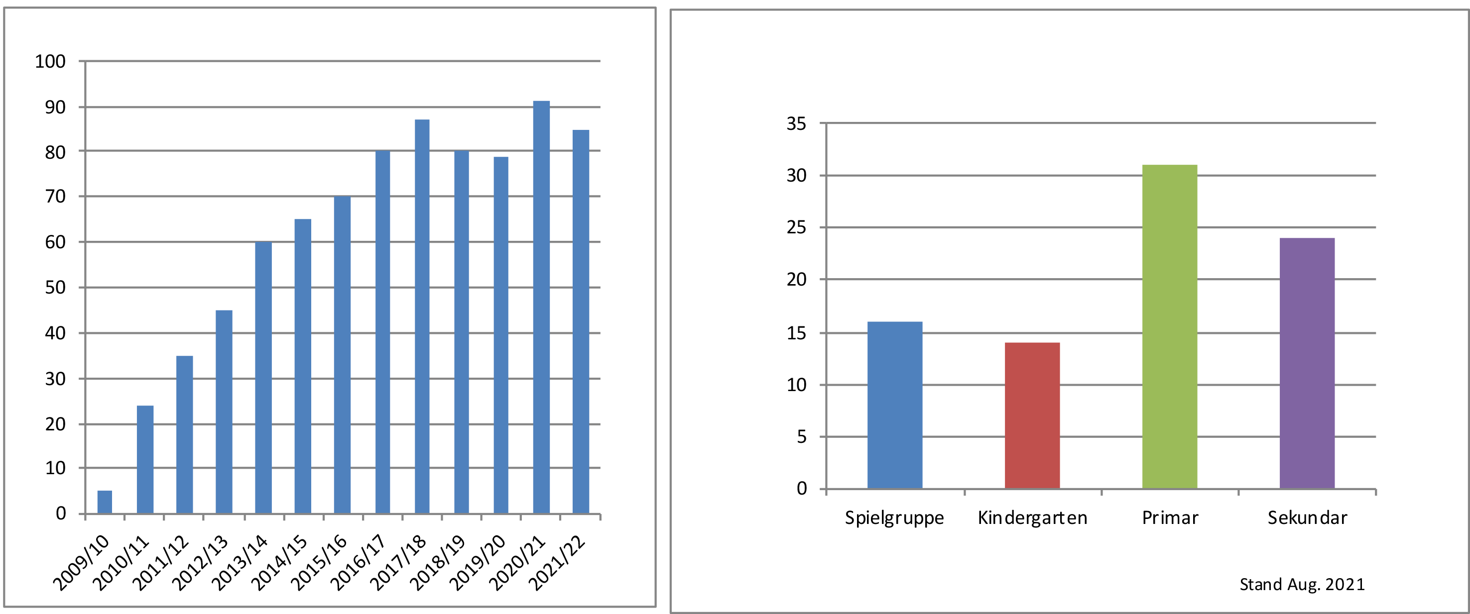 Seit August 2021 werden 69 Kindergarten- und Schulkinder sowie 16 Spielgruppenkinder betreut. Die PRISMA Schule beschäftigt 31 Mitarbeitende.